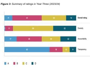 In 2024 we were selected for a second time and we were delighted to receive an A grade, based on the three areas; diversity, accountability and transparency. We are incredibly proud that our modern practices have been recognised and celebrated, giving us real confidence in the work we do.